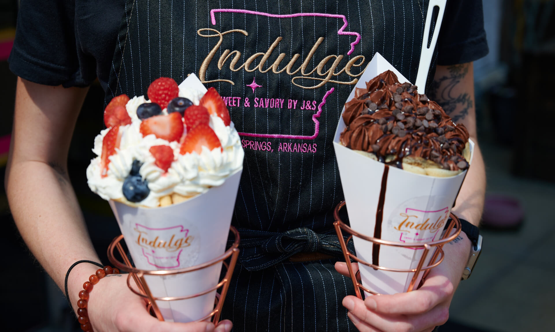 From savory crepes filled with delightful ingredients to creamy artisan gelato and warm, freshly baked cookies, our menu promises to satisfy every craving. Enjoy a full bar offering crafted cocktails and fine wines, alongside premium coffee service and whimsical cotton candy. Planning a day out? Grab one of our picnic baskets to-go and explore the beauty of Hot Springs!